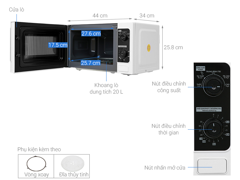 Dễ dàng sử dụng, an toàn cho gia đình Lò vi sóng được trang bị bảng điều khiển núm xoay với tiếng Việt rõ ràng, thân thiện với người dùng, đặc biệt là người lớn tuổi. Khay xoay bằng kính cường lực đường kính 255 mm chắc chắn, giúp thực phẩm chín đều trong quá trình nấu.