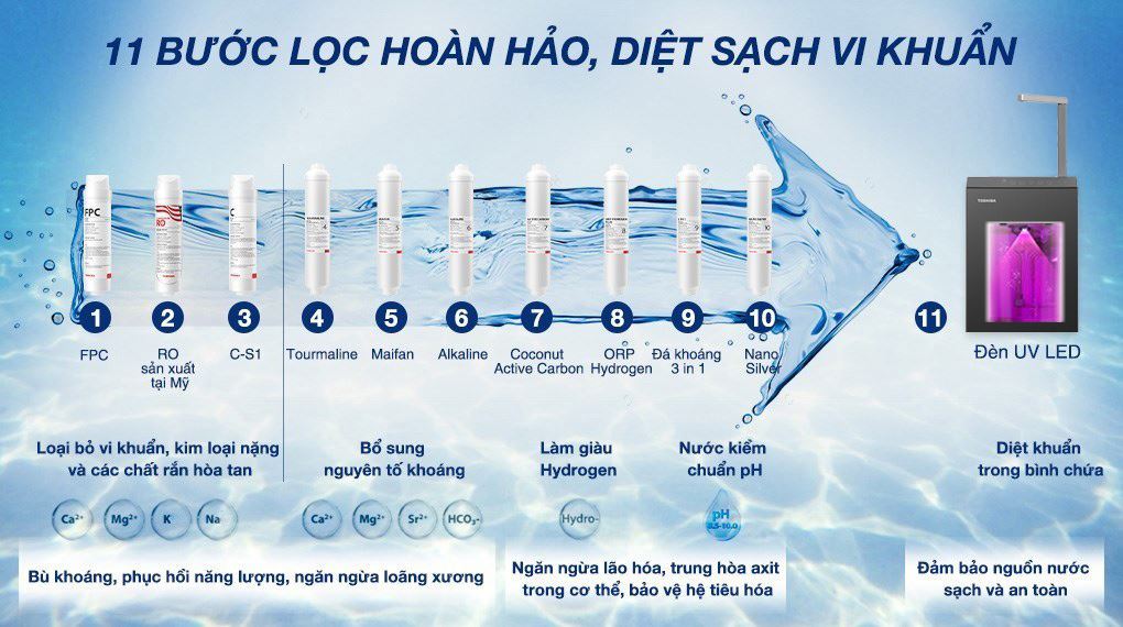 Máy lọc nước RO Toshiba TWP-W2396SVN(M) là giải pháp toàn diện mang đến nguồn nước tinh khiết cho gia đình và văn phòng với ba chế độ nước nóng, lạnh và nguội. Sản phẩm được trang bị hệ thống lọc 10 lõi cùng màng RO 75 GPD tiên tiến, loại bỏ đến 99,99% tạp chất, vi khuẩn, kim loại nặng và clo dư thừa. Đặc biệt, máy tích hợp đèn UV diệt khuẩn trong bình chứa, ngăn ngừa vi sinh vật tái sinh, đảm bảo chất lượng nước tinh khiết lâu dài.