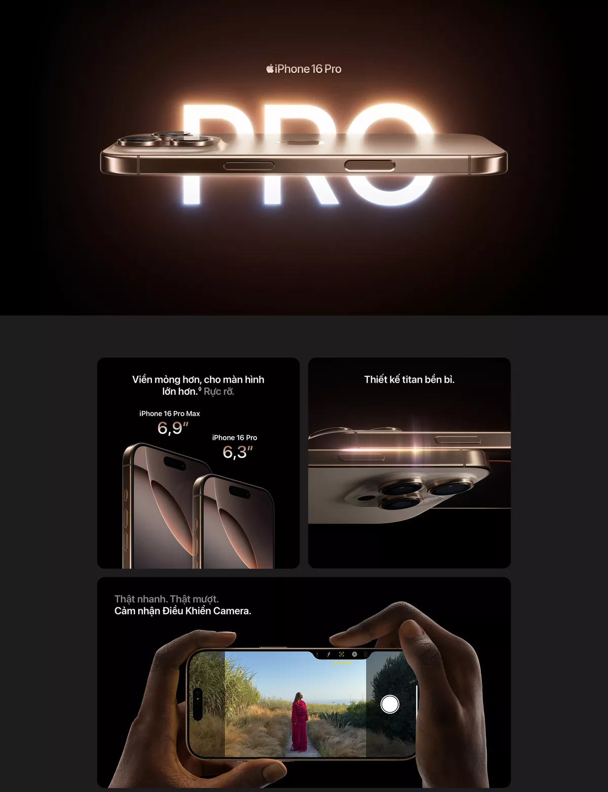 Cụm camera của iPhone 16 Pro Max được nâng cấp toàn diện với camera chính 48MP Fusion cho ảnh sắc nét, camera góc siêu rộng 48MP hỗ trợ chụp macro độc đáo và ống kính tele 5x 120mm với công nghệ chống rung dịch chuyển cảm biến, cho khả năng zoom xa cực kỳ rõ nét. Người dùng còn có thể quay video chuẩn điện ảnh với 4K Dolby Vision 120fps, micro chất lượng phòng thu và tính năng Camera Control giúp tùy chỉnh thông số nhanh chóng như trên máy ảnh chuyên nghiệp.