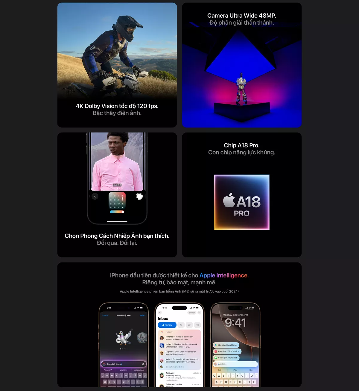Trái tim của iPhone 16 Pro Max 1TB là chip A18 Pro mới nhất sản xuất trên tiến trình 3nm. Bộ vi xử lý này không chỉ mạnh mẽ vượt trội ở CPU và GPU mà còn tối ưu cho trí tuệ nhân tạo Apple Intelligence, giúp xử lý thông minh, hỗ trợ gợi ý văn bản, tóm tắt nội dung và nhiều tính năng AI tiên tiến khác. Khả năng tản nhiệt tối ưu kết hợp viên pin dung lượng lớn mang đến thời lượng sử dụng lâu nhất từng có trên iPhone.
