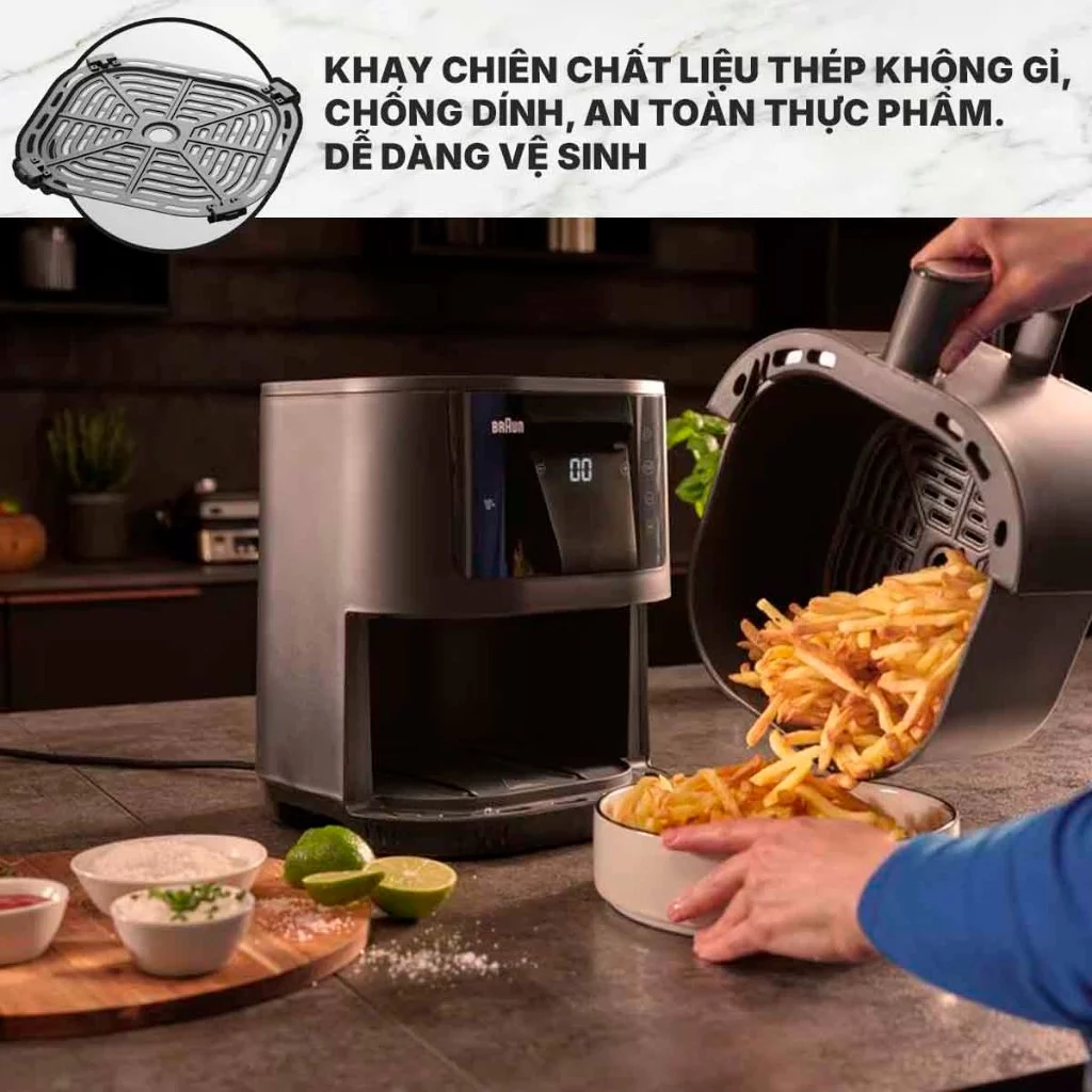 Nồi chiên Braun HF3030 trang bị bảng điều khiển điện tử hiện đại, dễ thao tác, cho phép điều chỉnh nhiệt độ và thời gian chính xác. Công nghệ Rapid Air giúp lưu thông không khí nóng mạnh, chiên nướng thực phẩm đều và giòn mà vẫn giữ được độ ẩm bên trong.