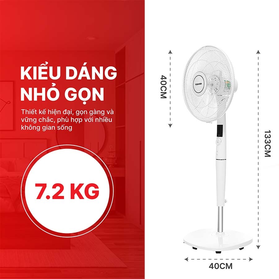 Sản phẩm có kích thước tổng thể 453 × 400 × 1.370 mm, trọng lượng 7,2 kg, vừa chắc chắn vừa dễ di chuyển. Với sự kết hợp giữa hiệu năng mạnh mẽ, thiết kế tinh tế và tính năng hiện đại, quạt cây Toshiba F-LSD30(W)VN là lựa chọn lý tưởng cho những ai tìm kiếm một giải pháp làm mát hiệu quả, bền bỉ và tiết kiệm điện năng cho gia đình.