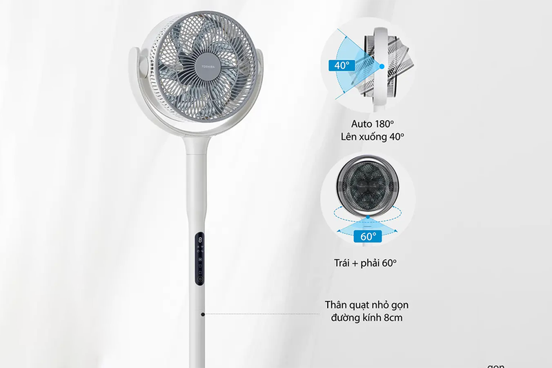 Quạt hỗ trợ nhiều chế độ gió, chức năng hẹn giờ và điều khiển từ xa bằng remote, mang lại sự thuận tiện tối đa cho người dùng. Khả năng xoay đa hướng giúp phân bổ gió đồng đều khắp phòng, làm mát hiệu quả ở mọi vị trí.